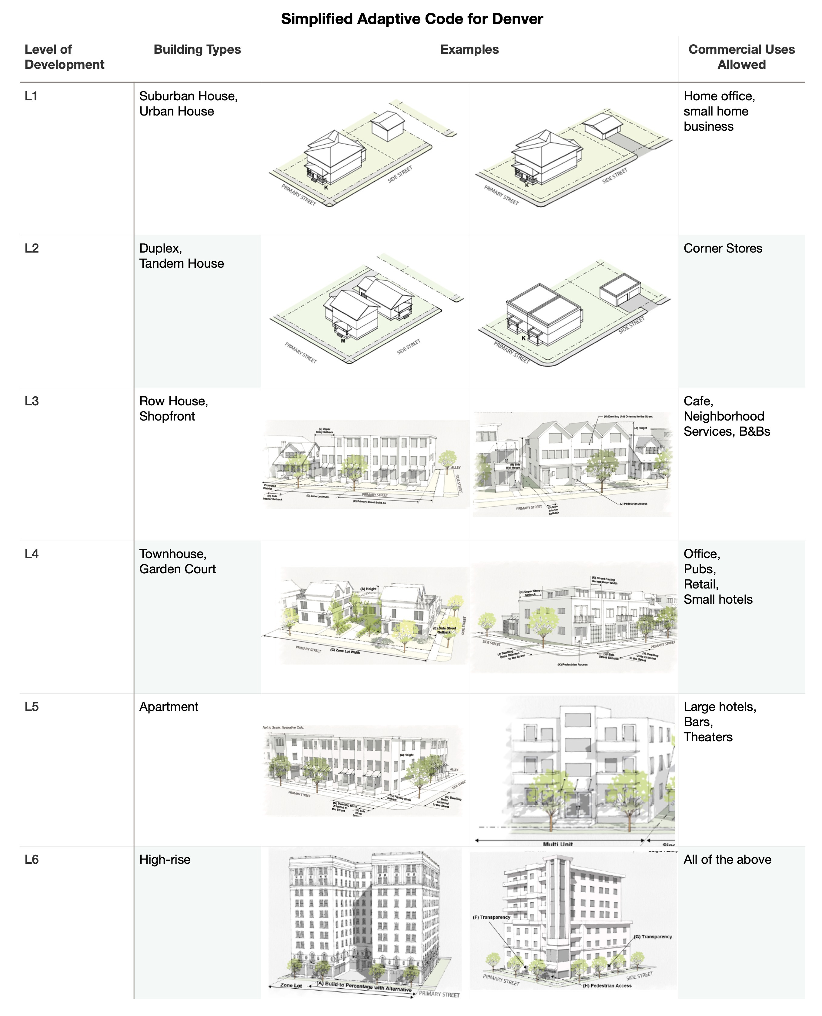 Denver’s zoning code already has great building blocks we can use to imagine an Adaptive Code.3 It specifies a variety of building types that developers can build, with design criteria the buildings need to meet. The code implies a general pattern, where smaller building types are allowed in lower density zones, and larger building types are allowed in higher density zones.