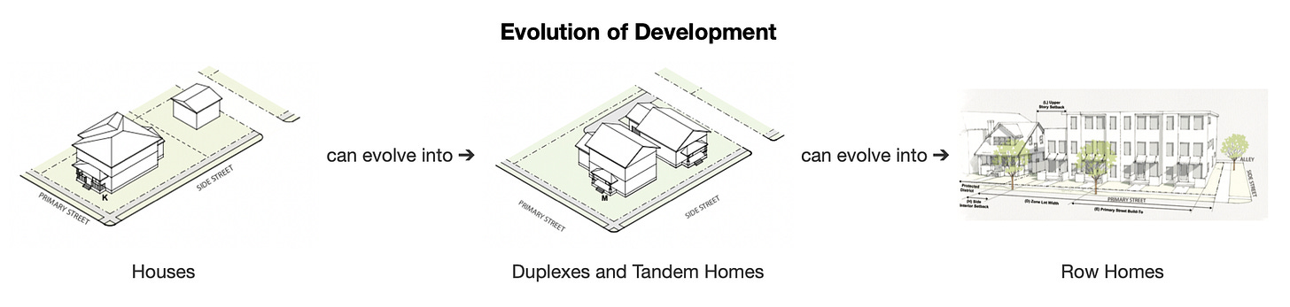 We could take these building types and explicitly organize them into a sequence of increasing levels of development (also known as a Transect).4 For example, we could say that houses are allowed to redevelop into duplexes or tandem homes, which in turn are allowed to redevelop into row homes. Each step in this sequence is one “level” of development.